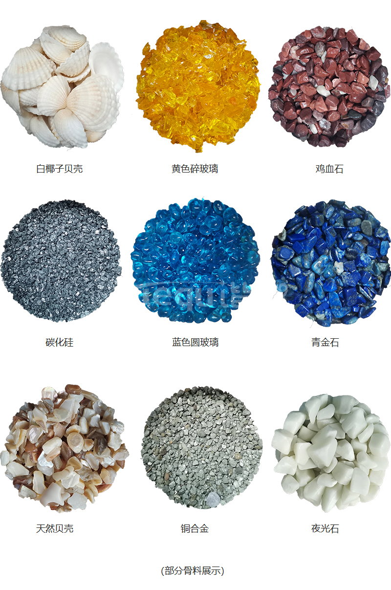 礫石聚合物藝術地坪所采用的骨料種類繁多,大體可分為金屬類、玻璃類、貝殼類、天然石料類。設計師可以根據不同的路面風格選擇相應的骨料類型和色彩,使路面富有藝術效果。